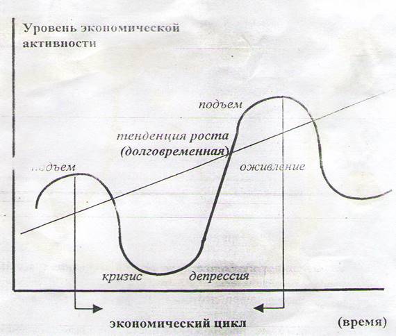 Одним из «изъянов» рынка является цикличность развития экономики. Экономический цикл – это форма движения рыночной экономики. За время цикла подъем экономики сменяется кризисом, депрессией, оживлением экономики и заканчивается цикл снова подъемом (Рисунок 4.1). Кризис характеризуется снижением экономической активности, что ведет к высокой инфляции и безработице.