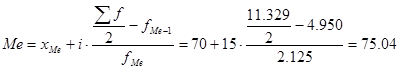 ) называется значение признака приходящееся на середину упорядоченной совокупности. Для ее определения достаточно расположить в порядке возрастания или убывания все варианты. Средняя варианта и будет являться медианой. Расчет медианы для интервального ряда производится по формуле: