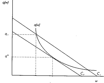 Условие определения оптимальной заработной платы показано на рис. 6.5. Фирма принимает функцию добровольных увольнений как данную и затем принимает решение по заработной плате, которая минимизирует издержки на труд. Издержки на труд показаны двумя изокостами C1 и C0, C1 > C0, которые имеют наклон 1/T (т. е. , если w увеличивается на единицу, то q снижается на 1/Т, чтобы издержки на труд одного работника оставались постоянными). При заработной плате w1 уровень добровольных увольнений — q1, а издержки на труд — C1. Заработная плата, обеспечивающая наименьшие издержки, будет расположена в точке касания линии изокосты и функции добровольных увольнений, там, где наклон функции добровольных увольнений (¶q/¶wi) равен наклону изокост ( —1/T). На рис. 6. 5 w* — заработная плата, соответствующая этой точке, q* — уровень увольнений, при издержках н»труд C0.