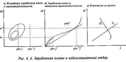 Заработная плата не только выполняет функцию вознаграждения, но и способствует отбору работников. Фирма, выплачивающая относительно низкую заработную плату, столкнется с проблемой неблагоприятного отбора, на нее будут наниматься работники с относительно низкой производительностью. Фирма, выплачивающая более высокую заработную плату, будет привлекать более производительных работников и сможет компенсировать высокую заработную плату повышенной производительностью работников. В качестве предпосылок модель эффективной заработной платы при неблагоприятном отборе содержит следующие положения: