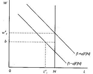 В состоянии 1 N работников будет занято, только если заработная плата будет меньше резервной заработной платы. Но заработная плата не может быть меньше резервной, поэтому в состоянии 1 w1 = b и фирма максимизирует прибыль, нанимая L01 работников. Оставшиеся N — L01 ( работников будут безработными.