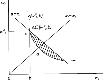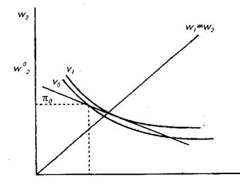 Поскольку эффект пропорциональности одинаков для каждой кривой, точка касания остается на линии определенности работника, где w1 = w2. Таким образом, вероятность безработицы не меняет жесткости заработной платы. Для любого r>0 любой контракт вне линии определенности является худшим по сравнению с тем, который лежит на линии определенности.
