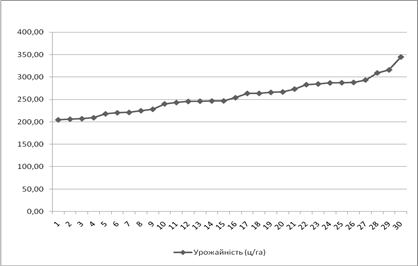 1. Урожайність зернових культур на базі даних яких виконувався даний курсовий проект є низькою. Більшість господарств мають рівень урожайності менше 40 ц/га, що є надзвичайно мало.