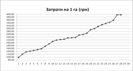 Кореляційним аналізом підтверджено результати факторного групування де між урожайністю та розміром витрат на 1 га встанолений прямий слабкої сили зв'язок (г=0,16).