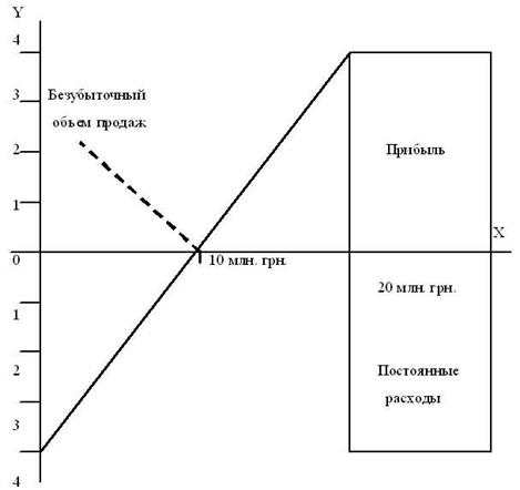 В нашем примере точка расположена на уровне 50 % возможного объема реализации продукции. Если пакеты заказов на изделия предприятия больше 50 % от его производственной мощности, то будет прибыль. При пакете заказов 75 % от возможного объема производства прибыль составит половину максимальной суммы, т.е.2 млн. грн.