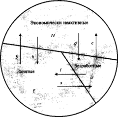 Можно выделить шесть основных потоков, которые определяют состояние рынка труда и уровень безработицы (рис. 10.1): от занятых к безработным и наоборот, от экономически неактивных к занятым и наоборот, от безработных к экономически неактивным и наоборот.