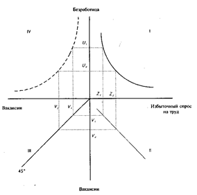 — соответственно уровень незанятых вакансий и уровень безработицы. Непосредственным измерителем избыточного спроса на труд является разница между уровнем вакансий и уровнем безработицы. Уровень безработицы как измеритель избыточного спроса на труд можно использовать только, если существует стабильная зависимость между уровнем вакансий и уровнем безработицы.