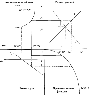 ). Однако если существуют негибкие цены и заработная плата, нет гарантии, что уровень спроса на продукт будет достаточен, чтобы потребить весь продукт, который хотят продать фирмы. Если такое происходит, фирмы оказываются ограничены объемом продукта, который они могут продать на рынке, и вследствие этого реальная занятость окажется слева от кривой спроса на труд DL
