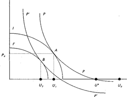’ отражает максимально возможный сдвиг кривой Филлипса с точки зрения соотношения общественных затрат и выгод от снижения безработицы. Новая равновесная позиция между допустимой для общества комбинацией безработица—инфляция I