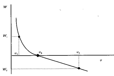 Так как чрезмерный спрос на труд практически трудно наблюдаемая величина, то существует необходимость заменить его на более наглядную переменную для анализа инфляции заработной платы. В качестве такой переменной был предложен уровень безработицы и. Зависимость между избыточным спросом на труд и уровнем безработицы будет обратной, отражая предположение о том, что чем выше избыточный спрос на труд, тем ниже уровень безработицы. Когда избыточный спрос на труд равен нулю, рынок труда находится в равновесии, а количество безработных U