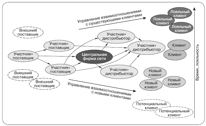 Сетевой подход необходим для понимания сети взаимоотношений (механизма создания и приведения в движение потока ценностей), соединяющих в единое целое производителя и конечного потребителя ценностей. Поэтому основным элементом новой модели будет цепочка взаимосвязанных фирм, создающих и предоставляющих ценность для потребителя. Исходным звеном в этой цепочке является потребитель/клиент. Другой характерной чертой предлагаемой модели нового подхода к маркетингу должно стать разделение клиентов на две группы — старые и новые и, соответственно, организация процессов по удержанию и обслуживанию старых клиентов в течение жизненного цикла (идея lifetime value в маркетинге взаимоотношений) и привлечению новых. Таким образом, фирма для создания конкурентоспособности через ориентацию на клиентов фактически выстраивает механизм управления потоком клиентов, включающим процессы как удержания старых, так и привлечения новых клиентов (рис. 1).