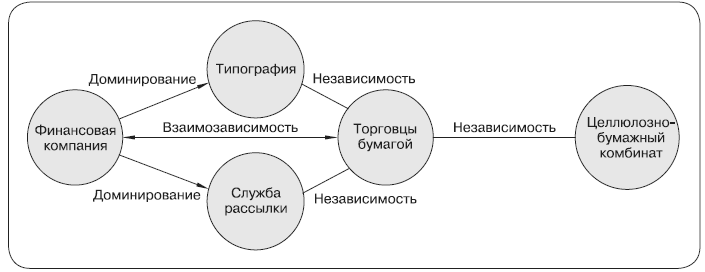 Таким образом, игнорирование наличия доминирующей фирмы в цепочке создания ценности и тех «структурных искажений», которые она привносит, чревато искажением реального механизма координации взаимодействующих на рынке фирм. Поэтому, стремясь к более адекватному воспроизведению реально существующего механизма координации в цепочке создания ценности, следует определять место и роль доминирующего звена и выяснять направления этого доминирования. Как это можно осуществить? Один из способов — визуализация сети взаимоотношений с обозначением на сети (рис. 2) реального доминирования и направлений его распространения по результатам интервьюирования участников сетевого взаимодействия.