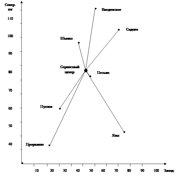 Рис.4. Размещение сервисного центра и потребителей его услуг на системе координат "Запад-восток - Север-юг"