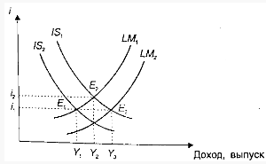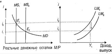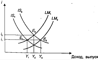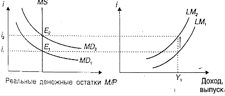 , центральный банк увеличивает предложение денег. Экспансионистская денежно-кредитная политика приводит к сдвигу кривой LM1