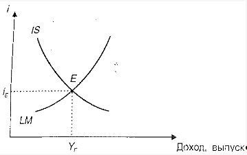 Графическое изображение модели IS-LM. Кривая IS отражает все комбинации Y и r, при которых товарный рынок находится в равновесии. Кривая LM — это все сочетания Y и r, которые обеспечивают равновесие денежного рынка. Чтобы определить общее равновесие на товарном и денежном рынках, необходимо совместить на одном графике обе кривые (рис. 7). Точка Е единственная, в которой оба рынка будут находиться в равновесии.