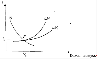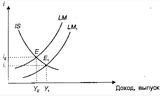 Допустим, первоначально рынки товаров и денег находятся в равновесии в точке пересечения кривых IS и LM — точке Е (рис. 10). Предположим, увеличилось предложение денег. Это обусловило сдвиг кривой LM вправо, в положение LM1