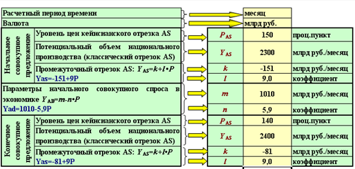 Также следует проанализировать и спрогнозировать изменения в экономике с использованием модели совокупного спроса и совокупного предложения (AD/AS). В нем проанализировать изменения основных макропоказателей при увеличении совокупного спроса или совокупного предложения. Рассчитать основные макропоказатели при сбалансированном росте совокупного предложения и совокупного спроса.