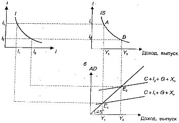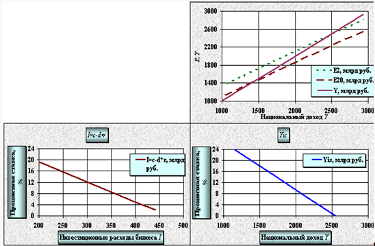 На товарном рынке рост совокупного спроса побуждает предпринимателей увеличивать инвестиции. Однако повышение ставки процента начинает сдерживать этот процесс, заставляя их сокращать планируемый, при процентной ставке rE