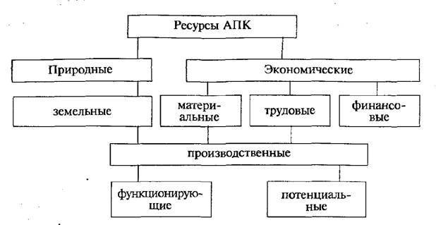 Термин «ресурс» применительно к экономике обычно означает средство, которое используется в процессе производства. Производственные ресурсы АПК — это совокупность трудовых, земельных и материальных ресурсов, используемых в процессе производства продукции (рис. 1) [1]. Наряду с производственными ресурсами в сфере производства функционируют финансовые ресурсы, которые состоят из денежных средств, используемых для обеспечения бесперебойного функционирования сельскохозяйственных и иных предприятий АПК, а также расходуемых на социально-культурные нужды. В их состав входят фонды обращения, амортизационный фонд, капитальные вложения, прибыль и др.