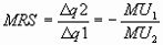 Предельная норма замещения (MRS) товаром Q1 товара Q2 показывает количество товара Q2, которым потребитель готов пожертвовать, ради приобретения одной дополнительной единицы товара Q1, при сохранении общего уровня удовлетворения неизменным.