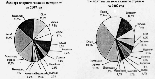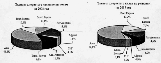 Анализ экспорта калийных удобрений на 2008 год показал, что по сравнению с аналогичным периодом 2007 года потеря валютной выручки в размере 61,2 млн.долл.США произошла в результате потери 68,7 млн.долл.США от поставок в страны Дальнего зарубежья и в результате увеличения на 7,5 млн.долл.США от поставок в страны СНГ.