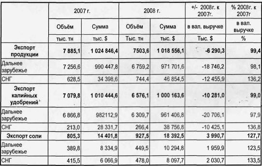 Объём экспорта хлористого калия в физическом весе за 2008 год составил 6576,1 тыс. тонн или 92,9% к аналогичному периоду 2007 года. Валютная выручка от объёма продаж данного вида товара за отчётный период составила 1000,2 млн.долл.США или 99,0% к аналогичному периоду прошлого года. Средневзвешенная цена на экспортируемый хлористый калий за январь-декабрь 2008 г. составила 152,09 долл./т., что выше средневзвешенной цены за январь-декабрь 2007 года (142,72 долл./т) на 9,37 долл.США.