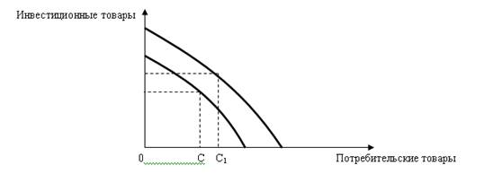 указывает расширение производственных возможностей экономики страны, т. е. границ потенциального ВВП, что говорит о наличии экономического роста. В результате одновременно возрастает и количество инвестиционных товаров (I→I1