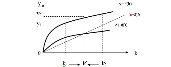 В ходе производства ежегодно пополняются капитальные запасы, независимо от того, с каким объемом капитала экономика начинает развиваться. Однако прирост фактических инвестиций, отображаемый графиком sf(k), идет затухающими темпами (см. рис.2).