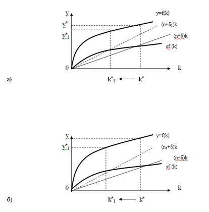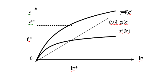 , происходящим по мере увеличения капиталовооруженности одного работника. Но наращивание капиталовооруженности увеличивает и объем требуемых инвестиций, представленных на рис.2 прямой линией (n + δ)k. Наклон этой линии определяется величиной (n + δ). С ростом производства разница между сбережениями sf(k) и требуемыми инвестициями (n + δ)k будет уменьшаться до тех пор, пока эти величины не выровняются между собой. Когда Δk = 0, тогда производство, сбережения и требуемые инвестиции достигают определенного устойчивого уровня, т.е. экономика достигает состояния равновесия. В равновесном состоянии объем выпуска не изменяется, а сбережения и требуемые инвестиции равны: