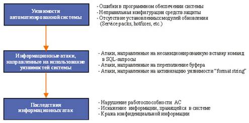 Для реализации информационной атаки нарушителю необходимо активизировать или, другими словами, использовать определённую уязвимость АС. Под уязвимостью принято понимать слабое место АС, на основе которого возможна успешная реализация атаки. Примерами уязвимостей АС могут являться: некорректная конфигурация сетевых служб АС, наличие ПО без установленных модулей обновления, использование нестойких к угадыванию паролей, отсутствие необходимых средств защиты информации и др. Логическая связь уязвимости, атаки и её возможных последствий показана на рис. 1.