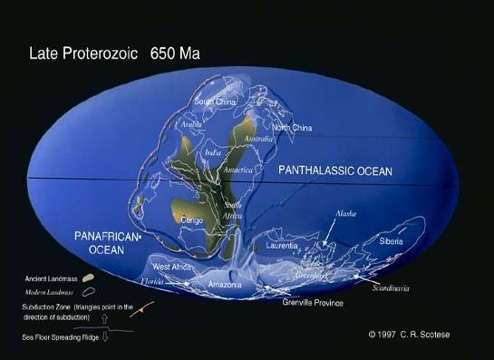 Рис. 1. Океаны и суша позднего протерозоя. [15]