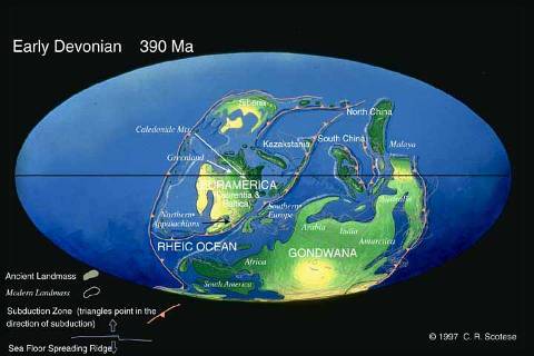 Девон — период относительного тектонического покоя. Существовали четыре океана, три крупных материка и несколько мелких. Суша значительно раздроблена и почти целиком располагалась в Западном полушарии (рис. 3). На юге Западного полушария разместилась Гондвана, на севере — Еврамерика, Сибирь и мелкие массивы. Континенты сближались, лежавшие между ними океаны (Рея, Уральский и Палеотетис) уменьшались в размерах.