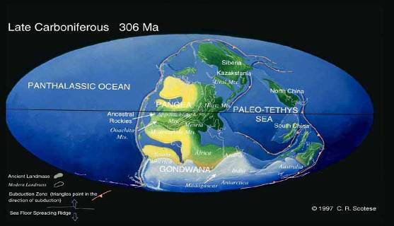В карбоне вся суша лежала в Западном полушарии. В результате сближения материков началась герцинская складчатость. Еврамерика вплотную приблизилась к Гондване, и океан Рея практически замкнулся, став одним из заливов Палеотетиса. С севера к Еврамерике почти примкнули Сибирь и Казахстан, что привело к исчезновению Уральского океана. Таким образом, в карбоне началось формирование грандиозного суперконтинента Пангеи — в него пока не вошли только Сибирская и Китайская платформы, которые были представлены разрозненными островами (рис. 4).
