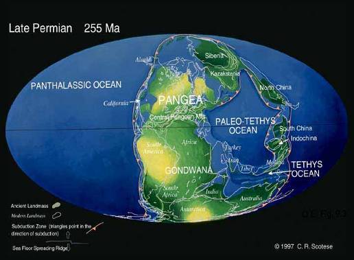 После объединения древних платформ остался по сути лишь один океан – Панталасса. От него внутрь Пангеи гигантским заливом с востока внедрялся океан Палеотетис. [7]