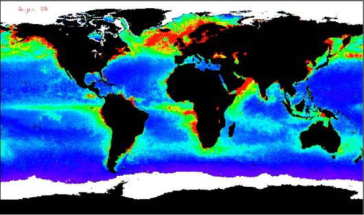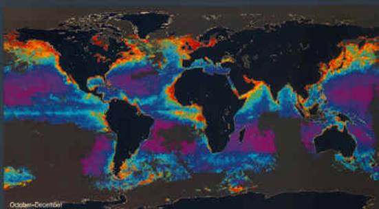 На глобальной карте цветового индекса хорошо прослеживаются главные черты распределения фитопланктона в Мировом океане — его концентрация в более холодных прибрежных шельфовых водах (желто-оранжево-красные цвета) и в районах подъема холодных глубинных вод (апвеллингов) при относительной бедности вод открытого океана и наличии «океанических пустынь» в тропических и субтропических широтах (сине-фиолетовые цвета). Увеличение концентрации фитопланктона в экваториальных водах Атлантического и Тихого океанов в октябре–декабре (голубая полоса) обусловлено подъемом относительно холодных вод в связи с ветровой деятельностью.