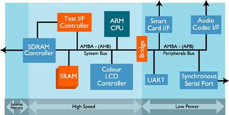 Под приборами класса "система-на-кристалле", в общем случае, подразумеваются приборы на едином кристалле которых интегрированы процессор (процессоры, в том числе специализированные), некоторый объем памяти, ряд периферийных устройств и интерфейсов - т.е. максимум того, что необходимо для решения задач, поставленных перед системой. Фирмой ARM, кроме уже упоминавшихся ядер семейств ARM7 и ARM7TDMI и ряда семейств, которые будут рассматриваться ниже, разработан набор макроячеек периферийных компонентов, которые фирма на основе лицензионных соглашений предоставляет заказчикам. Периферийные компоненты фирмы ARM, библиотека которых получила наименование PrimeCell, представляют собой готовые к применению отработанные программные макроячейки, при разработке которых обращалось внимание на возможность многократного их использования, и применяя PrimeCell периферию разработчик существенно экономит время и стоимость разработки за счет концентрации усилий на создании именно системы на кристалле, а не на разработке сначала необходимой периферии и лишь затем системы. В настоящее время в библиотеку входят: UART, контроллеры SDRAM, синхронные последовательные интерфейсы, часы реального времени, аудио кодеки, средства I/O общего назначения, интерфейсы смарт карт, контроллеры цветных LCD. Ведутся работы по дальнейшему расширению библиотеки.