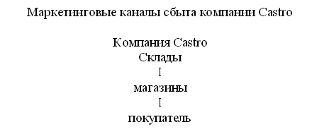 Платья «Castro» можно отнести к исключительному сбыту. Эта форма сбыта используется для изделий высокого качества, которые имеют большую ценность для покупателя. Во время покупки товаров покупатель способен тратить большие деньги на их приобретение. Платья реализуется через дистрибьюторов и продается посредством закупки в магазины. Компания «Castro» использует интенсивный метод распределения заказов, продавая товар в максимальном числе торговых точек (через широкую сеть магазинов по странам – Россия, Латвия, Украина, Швейцария, Румыния и Таиланд). Стабильные продажи достигаются за счет постоянных покупателей, налаженной системы скидок.