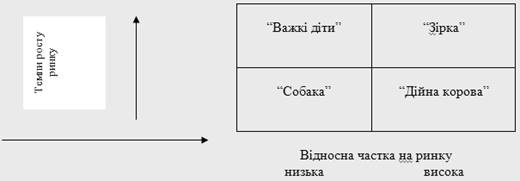Для побудови матриці БКГ фіксуємо по горизонтальній осі значення відносної частки ринку, по вертикальній — темпів росту ринку. Далі, розділивши дану площину на чотири частини, одержуємо матрицю (рис.1.1):