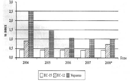 В 2004—2009 гг. как в Украине, так и в государствах — членах ЕС наблюдалось сокращение объемов предоставления предприятиям государственной поддержки как доли ВВП (рис.1). В странах ЕС основное сокращение этого показателя происходило за счет стран — новых членов (ЕС-12), а в странах - старых членах (ЕС-15) он остался почти неизменным. Необходимо подчеркнуть, что в 2002—2004 гг. в странах ЕС-12 предприятиям предоставлялось значительно больше государственной поддержки, которая направлялась на структурные реформы с целью адаптации их экономик к рыночным условиям. Позднее объемы такой поддержки существенно сократились.