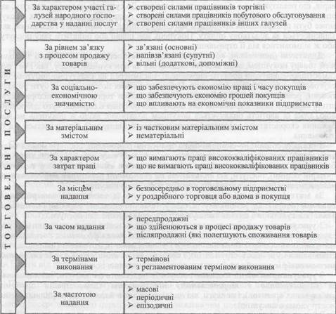 Для правильної організації надання торговельних послуг їх необхідно правильно класифікувати (мал.1.2,1.). Так, залежно від характеру участі галузей народного господарства в процесі надання послуг можна виділити послуги, які надаються силами працівників торгівлі (наприклад, дрібна переробка швейних виробів, придбаних у магазині), послуги, які надаються силами працівників підприємств побутового обслуговування (наприклад ремонт годинників), послуги, які надаються силами працівників підприємств інших галузей народного господарства (перевезення товарів засобами транспортних підприємств, обмін валюти обмінним пунктом комерційного банку тощо).