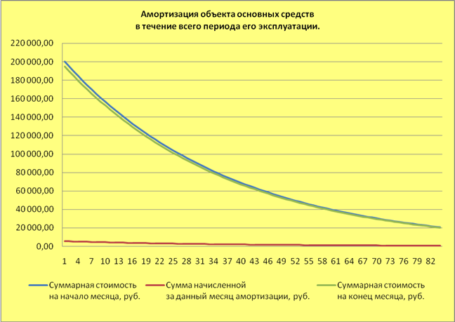 начисления амортизации по своей сути, во многом совпадает с начислением амортизации способом уменьшаемого остатка в бухучете. Но остаточная стоимость объекта определяется не на начало года, а начало каждого месяца. Таким образом, если в бухучете при начислении амортизации ежемесячная сумма в течение всего года будет неизменной, то в налоговом учете она будет уменьшаться каждый месяц (см. таблицы №4,5; графики №3 и №4).