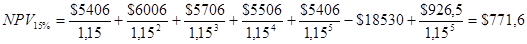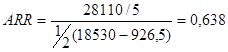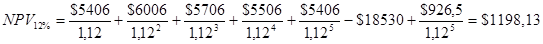 Інвестиції становлять $18530 в 0-й рік. Грошовий потоки за п'ятирічний строк становлять: $5406, $6006, $5706, $5506, $5406. Доходи покриють інвестиції на 4 рік. За перші 3 роки доходи становлять: