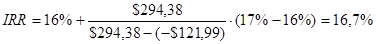 Виходячи з розрахунків, наведених у табл. 3.5, можна зробити висновок: що функція NPV=f(r) міняє свій знак на інтервалі (15%,16%).