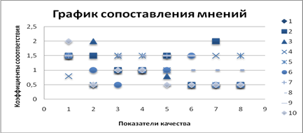 Точками обозначены значения коэффициентов соответствия каждого из экспертов по всем показателям.