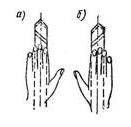 При измерении мелких деталей микрометр находится в правой руке (рис. 21, а). Микрометр прижимают мизинцем или безымянным пальцем к ладони, а большим и указательным пальцами вращают барабан или головку трещотки. Измеряя деталь сравнительно больших размеров, микрометр держат левой рукой у пятки (рис. 21, б), а правой поддерживают его, вращая пальцами этой руки барабан или трещотку.
