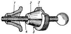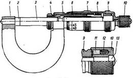 В этот момент заостренный конец штифта 11 будет проскакивать по зубьям на колпачке 9, чем и обеспечивается постоянство измерительного усилия. Посредством гайки 4, навертываемой на левый надрезанный конец втулки 6, шпиндель микрометра может быть закреплен в выбранном положении.