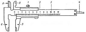 Такой штангенциркуль типа ШЦ-1 (рис. 87) состоит из штанги 3 с губками А и С, рамки 2 с губками В и D и линейки 4, соединенной с рамкой 2. Рамка охватывает штангу 3 и может перемещаться по ней. Для закрепления рамки в требуемом положении служит винт 1 с накатной головкой.