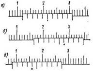 Губки С и D рассматриваемого штангенциркуля используются при измерении наружных диаметров и длины детали, губки А и В — при измерении диаметров отверстий, ширины различных канавок и т. п., а линейка 4 — для измерения длины деталей, глубины канавок, выточек и т. д. На штанге 3 нанесена шкала, каждое деление которой равно 1 мм. На нижней скошенной кромке выреза рамки 2 нанесена вторая шкала, называемая нониусом. Общая длина шкалы нониуса, разделенная на 10 частей, равна 19 делениям шкалы, нанесенной на штанге, т. е. 19 мм. Штрихи штанги и нониуса, около которых нанесен знак нуль, называются нулевыми. Шкалы на штанге и нониусе расположены таким образом, что когда губки штангенциркуля сдвинуты плотно, нулевой штрих нониуса точно совпадает с нулевым штрихом штанги. Поэтому измерение длин, диаметров и т. д., содержащих целое число миллиметров, производится по нулевому штриху нониуса. Если, например, при измерении какой-либо детали нулевой штрих нониуса точно совпал с 12-м штрихом штанги (рис. 12, а), это значит, что данный размер детали равен 12 мм. Если нулевой штрих нониуса не совпадает с каким-либо штрихом штанги, замечают прежде всего, какой штрих штанги уже пройден нулевым штрихом нониуса. На рис. 12, б это 16-й штрих. Затем смотрят, какой штрих нониуса лучше всех остальных совпадает с каким-либо штрихом штанги. На рисунке это 6-й штрих. Это значит, что штангенциркуль установлен на размер 16,6 мм. Показание штангенциркуля на рис. 12, в соответствует размеру 8,4 мм. Таким образом, величина отсчета по нониусу рассмотренного штангенциркуля составляет 0,1 мм. Погрешность измерения лежит в пределах ±0,1 мм и зависит от точности отсчета по нониусу и от измеряемой длины. Измерение небольшого наружного диаметра детали штангенциркулем показано на рис. 13, а. При таком измерении штанга штангенциркуля не должна касаться поверхности измеряемой детали. Если штангенциркуль окажется в положении, показанном на рис. 13, б, то будет измерена, очевидно, хорда, а не диаметр детали. Правильный способ применения штангенциркуля для измерения большого наружного диаметра детали изображен на рис. 13, в. Если при плотно сдвинутых губках штангенциркуля нулевой штрих нониуса не совпадает с нулевым штрихом штанги, или при совпадении этих штрихов рабочие поверхности губок касаются друг друга не по всей своей длине, это означает, что штангенциркуль неисправен и должен быть сдан в ремонт.