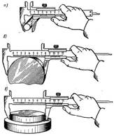Рис 13 – Приемы измерений штангенциркулем: правильное измерение небольшого диаметра (а), неправильное (б) и правильное (в) измерения большого диаметра