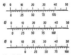 Нониус рассматриваемого штангенциркуля имеет 20 делений, каждое из которых при отсчете принимается за пять. Поэтому цифра 25 нанесена на нониус против 5-го штриха, цифра 50 против 10-го и т. д. Таким образом, 1-й штрих нониуса дает 5-е деление, 4-й — 20-е, 1-й после 25-го — 30-е деление и т.д. Все 20 делений нониуса равны 39 делениям штанги, т. е. 39 мм, так что каждое его деление равно 39/20 =195/100= 1,95 мм. Вследствие этого никакие два или более штрихов нониуса не могут одновременно совпадать со штрихами шкалы штанги. Исключение составляют нулевой и самый последний штрихи нониуса, которые одновременно совпадают со штрихами шкалы штанги. Отсчет показания штангенциркуля при таком положении нониуса производится только по нулевому штриху, но не по последнему.